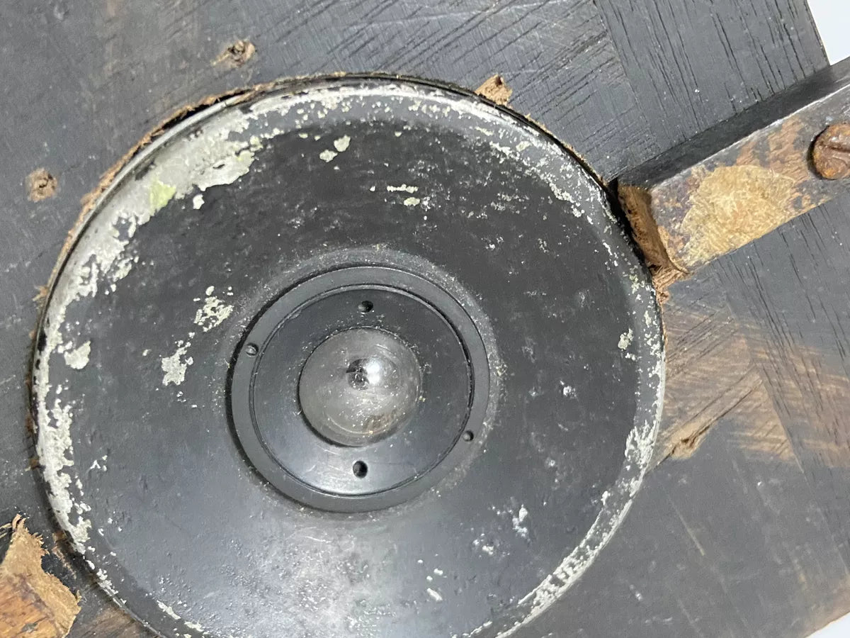Acabamento em madeira com pátina autêntica, fissuras naturais e marcas do tempo — reforçando seu valor como peça de coleção.