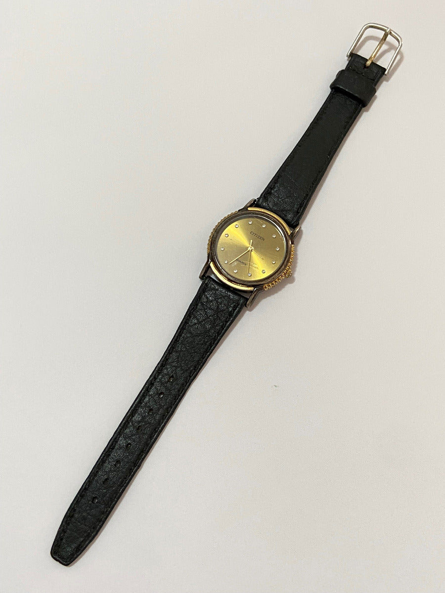 Relógio Antigo Citizen Quartz Dourado Pedras Pulseira Couro Preto