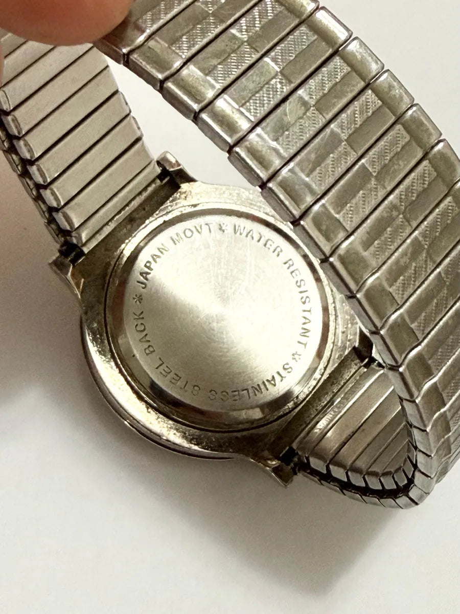Caixa em aço, pulseira expansível metálica e fundo marcado “Japan Movt – Water Resistant – Stainless Steel Back”.