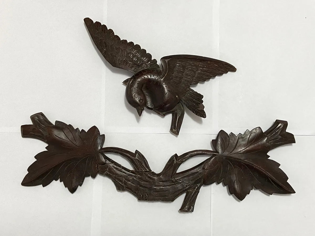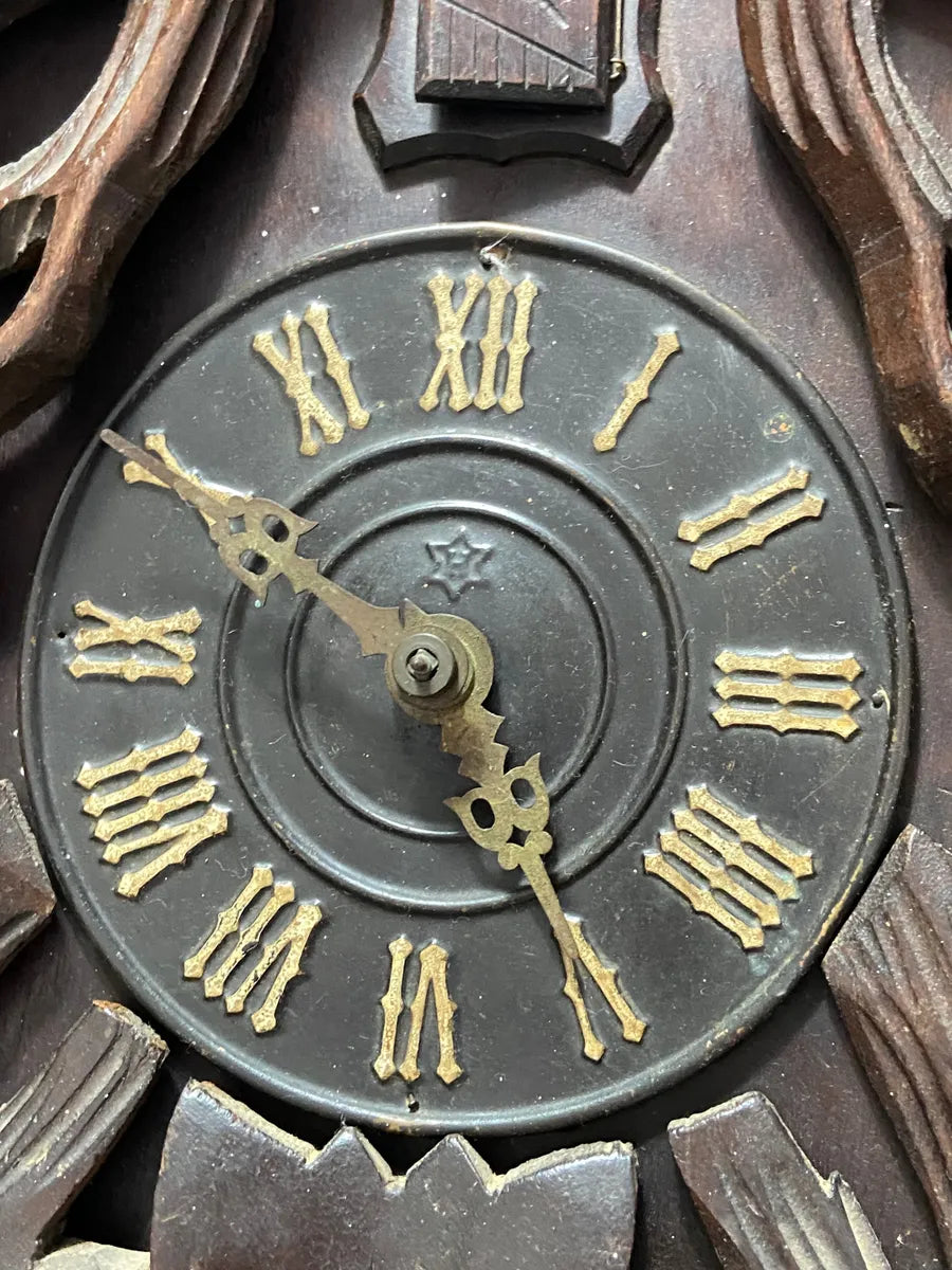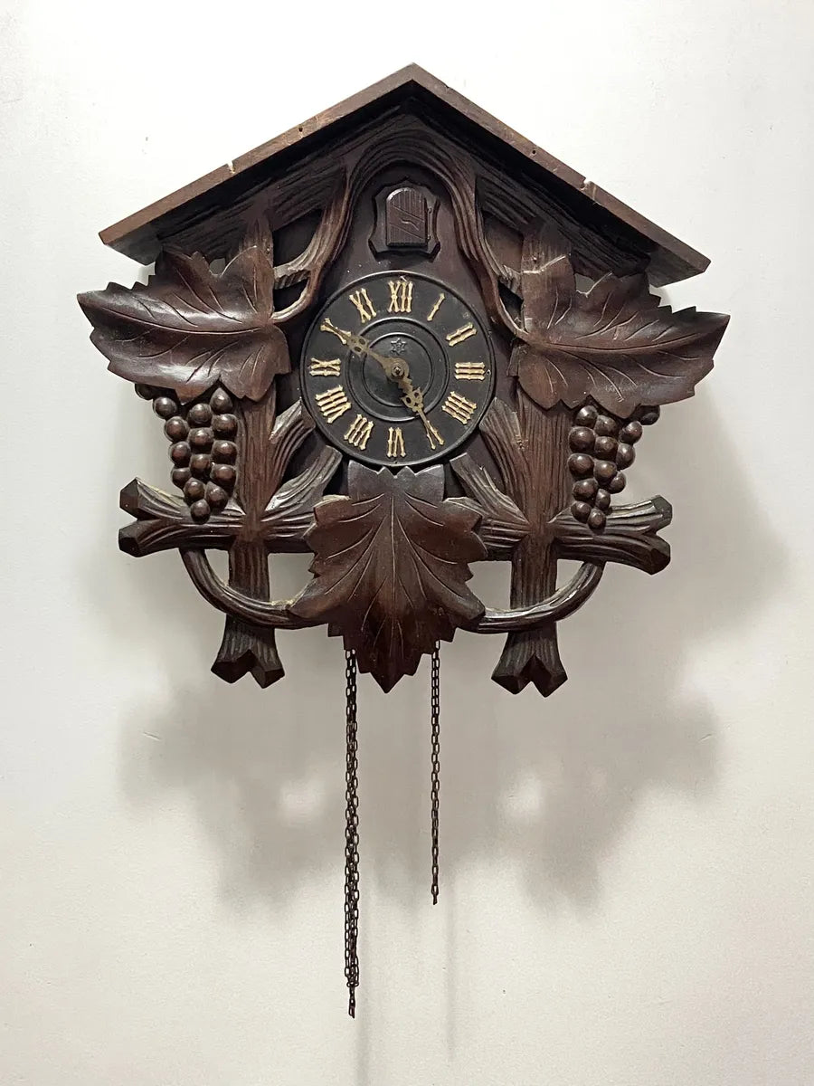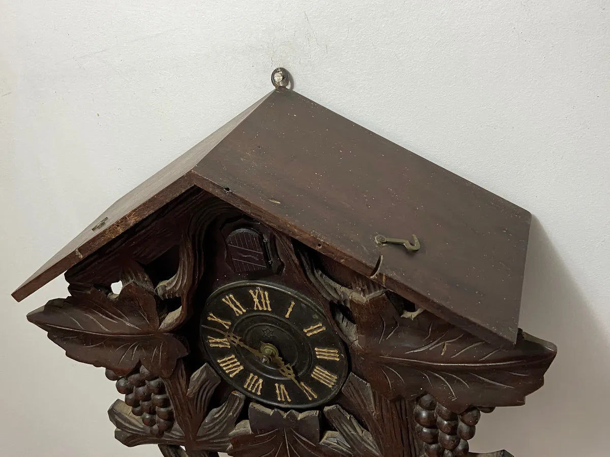 Relógio cuco antigo de parede estilo Floresta Negra ricamente entalhado em madeira maciça com detalhes de folhas e cachos de uva acompanha todas as peças originais incluindo pêndulo entalhado em forma de folha dois pesos em formato de pinha em ferro fundido adorno superior com pássaro esculpido em madeira e aplique inferior com folhagens em alto relevo.