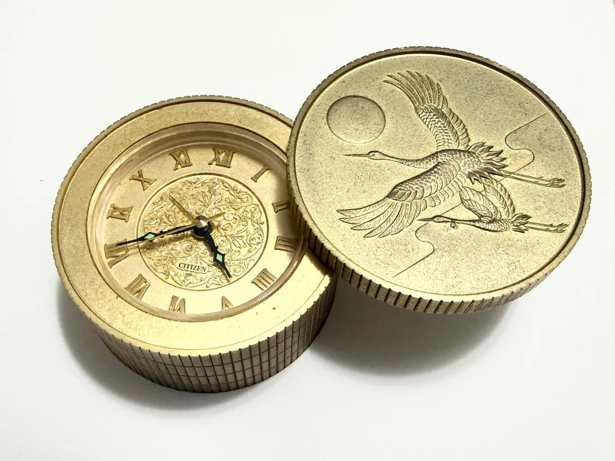 Raro relógio de mesa Citizen, fabricado no Japão, em corpo metálico de tom bronzeado com tampa decorada em relevo mostrando duas garças em voo sob o sol, símbolo tradicional japonês de longevidade e prosperidade.