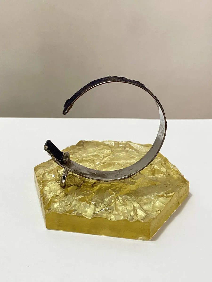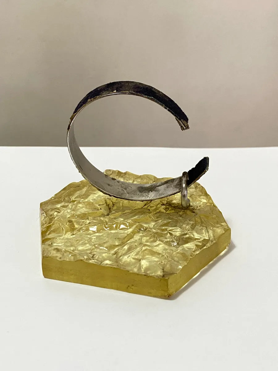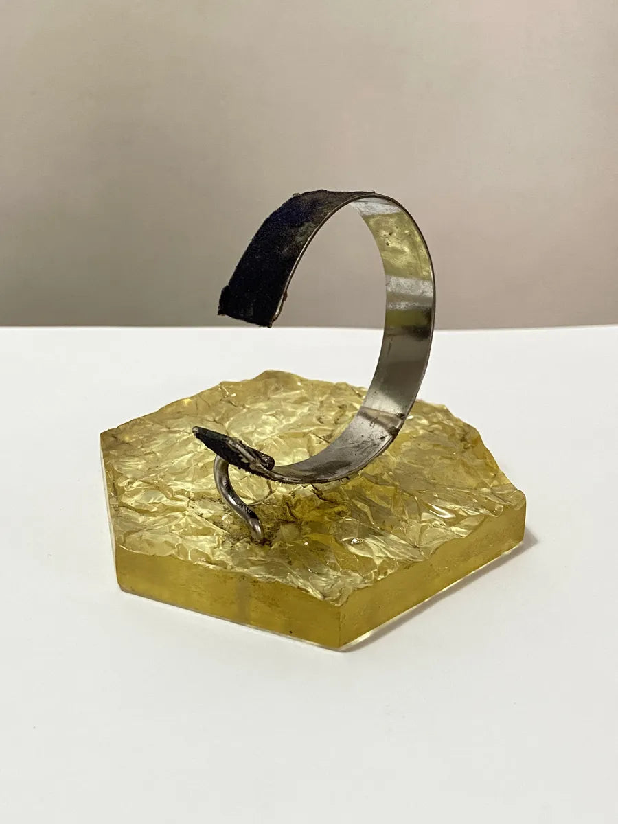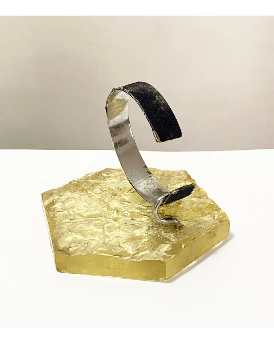 Expositor antigo artesanal ideal para relógios ou pulseiras. Possui base sólida em resina amarela translúcida com textura de cristal, conferindo charme e estabilidade à peça.