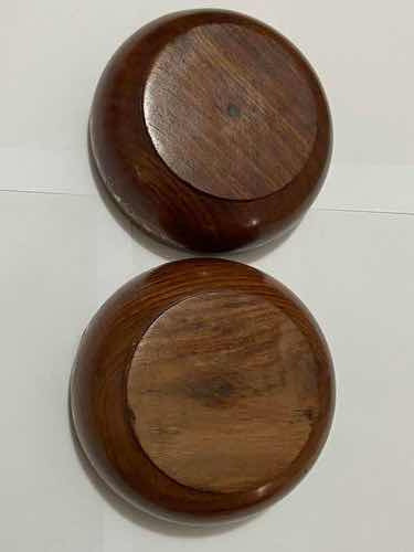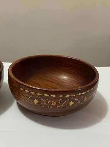 Par de tigelas artesanais antigas, confeccionadas em madeira nobre de jacarandá, com lindos detalhes decorativos em metal dourado e cobre incrustados ao redor. Peças elegantes e raras, perfeitas para decoração, coleção ou uso especial em sua mesa.
