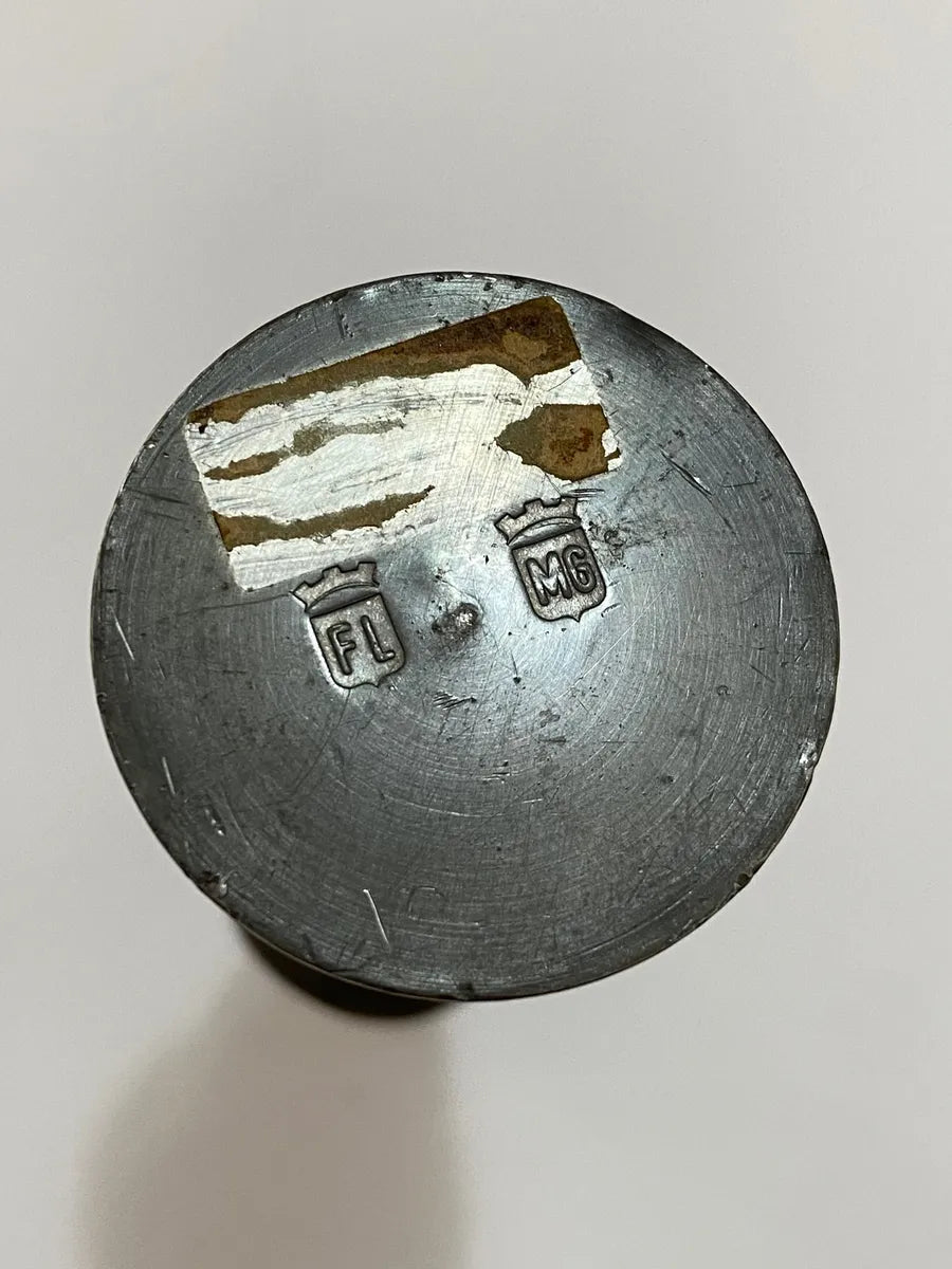 A base traz duas marcações em relevo sob uma coroa estilizada: "FL" e "M6", que sugerem origem europeia e possivelmente remetem ao fabricante ou ao padrão do estanho utilizado, o que é típico em peças de origem alemã ou italiana do século XX.